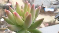 藍黛蓮的花序呈倒鍾形,花瓣呈寬倒卵形或者寬橢圓形,花色為紅色,頂端為黃色,花期在9~10月。主要通過櫱芽和扦插的方式進行繁殖,溫度控制在10~25℃之間,屬於擬石蓮花屬與厚葉草屬的雜交品種。